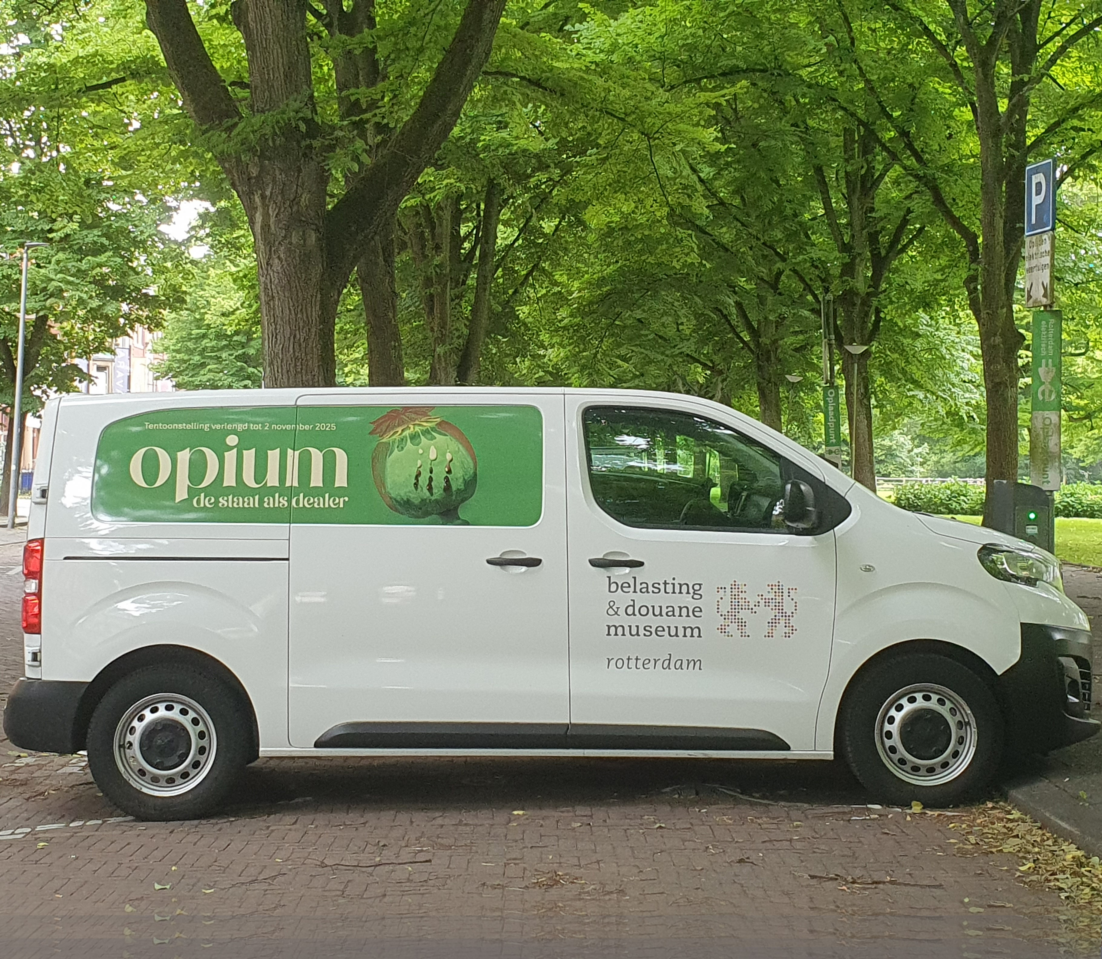 Due to success the opium exhibition: Opium, the State as Dealer, originally scheduled to run until today, has now been extended until November 2nd. Anyone who hasn't yet visited the Tax and Customs Museum in Rotterdam will have longer opportunities to learn all about the lucrative opium trade. It's convenient that the museum has its own company car for advertising. This was also used to collect the loans from our collection, which were necessary to tell the complete story.